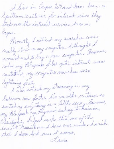 When I talk to people I get predictable and sometimes "humorous" responses. Most common are "I can't believe it is better" "Your price is so low, what is the catch" and, MY ALL TIME FAVORITE: "I'm too old to make a change like that." Every time I sign up someone with one of our several partners for Fiber Optic Internet, I ask them to email me or text me their honest review. FULL DISCLOSURE: If I like what they write, I pay them for the privilege of using those reviews. Not many take me up on my request, but sometimes they do. Here are a couple of those reviews. Top of the list: My customer, Laura, from Casper, WY who is in her EIGHTIES. See! Not too old to save money and get GREAT FIBER INTERNET!